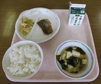 さて、今日のメニューですが、汁物は豆腐とわかめのすまし汁!「豆腐とわかめ」というとみそ汁、というイメージがありますが、今日はすまし汁です。おかずがさばのみそ煮なので、こっちは醤油ベースのすまし汁にしたのかもしれませんね。出汁の効いた、すっきり味のすまし汁でした。