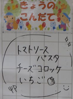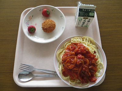 今日は金曜、麺の日です!今日のメニューはトマトソースパスタ!甘みと酸味のバランスが良いトマトソースをたっぷりかけていただきます。子ども達は口の周りを真っ赤にして食べていましたよ。