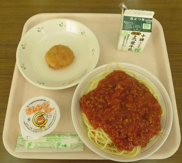 今日は金曜、麺の日です!今日のメニューはミートソーススパゲティ!トマトの甘みと酸味、そして旨味がギュッと詰まったミートソースをたっぷりかけていただきます。この時期にトマトをたっぷり味わえるのはうれしいですね。