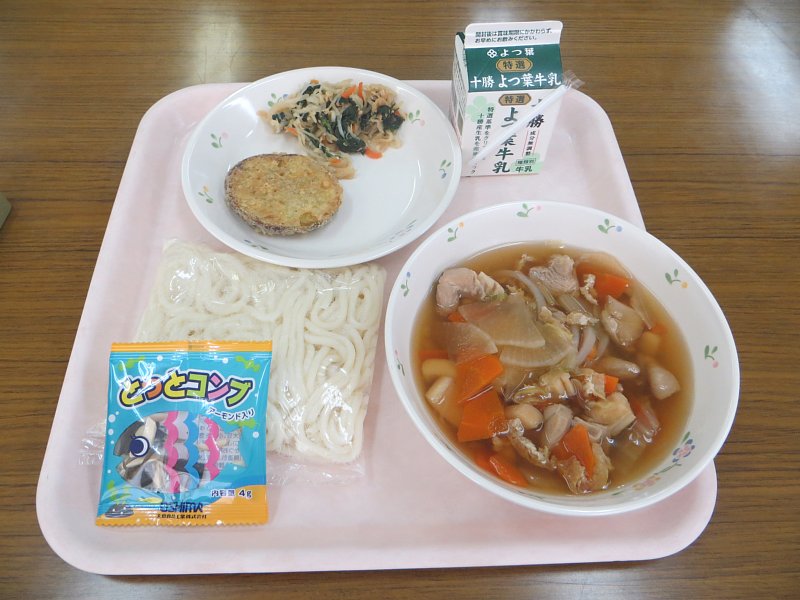 今日は金曜、麺の日です!今日のメニューはちゃんこうどん!鶏肉にいか、油揚げ、人参、大根、白菜、長ねぎ、つきこんにゃくと、具がたっぷり!出汁の効いたおつゆと一緒に美味しくいただきました。