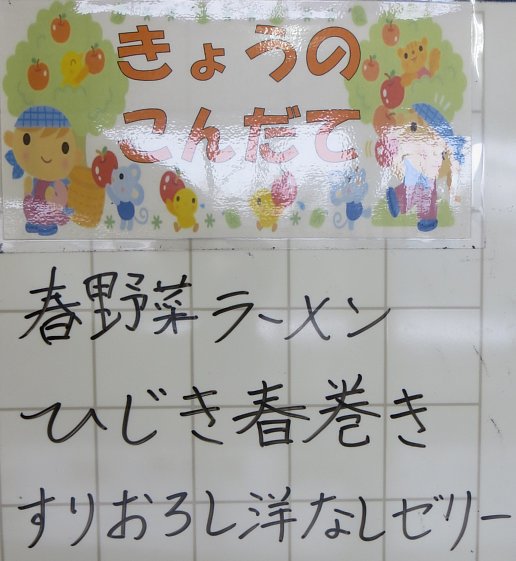 コーンフライは、コーンたっぷり!「コーンコロッケ」ではないので、コロッケと思って食べた子からは「なんかいつものと違う~」という声も上がっていましたが(^^;、こちらも自然な甘さを楽しめる一品でした。