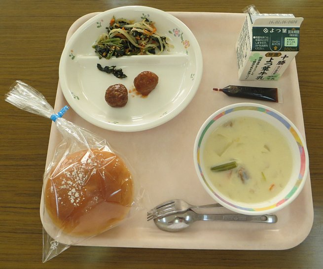 コーンポタージュはコーンの甘さがたっぷりと感じられます。いつもの給食時間だと、配膳の時に「これ減らしてください」「もう少し減らしてください」といった声ばかりが聞こえてきますが、今日は「もう少し増やしてください」「もっと入れてください」という声ばかり!ポタージュは完食となりました!