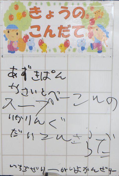 そして、この日の給食には、なんとミルメークがついてきました!大人たち大盛り上がり!(^^;。子ども達は初めて目にするミルメークに、「どうすればいいの?」「牛乳に入れるとどうなるの?」とちょっと不安げ。コーヒーが苦手なのでちょっと…という子もいましたが、いつもの牛乳がコーヒー牛乳となり、ちょっと贅沢な気分を味わうことができました。