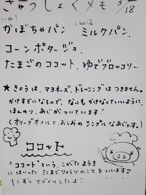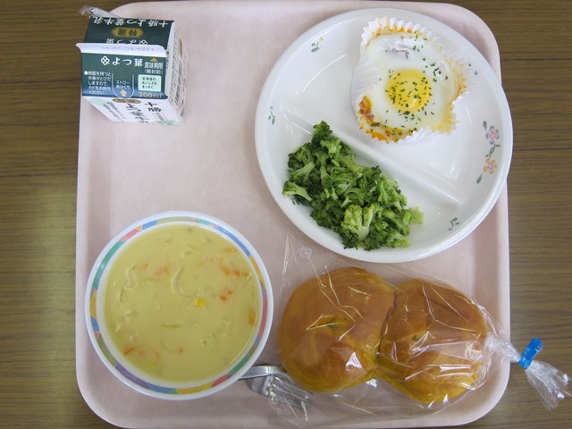 本日の「コーンスープ」と「豆腐ミートローフ」に清里産の玉ねぎが使われているそうです。