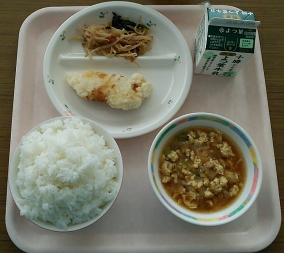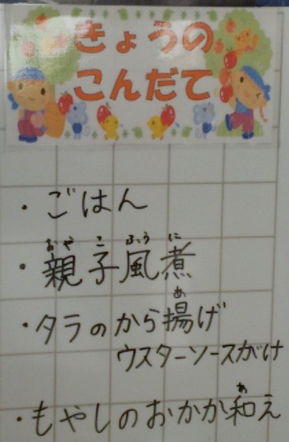 今日のお昼は親子風煮!汁がたっぷりの親子丼の具、のようなもの。そのままご飯にかけて食べたい!…といった感じです。子ども達も、「今日はこれ(親子風煮)があるからご飯が進むね~!」と言いながら食べていました。
