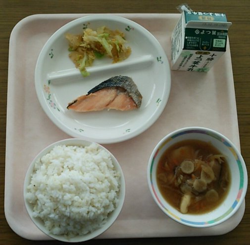 おかずには程よい塩分がスケートで疲れた体にうれしい鮭の塩焼きと、即席漬けがついて、大人にとってはちょっぴりノスタルジックな給食となりました。