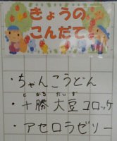 今日のアセロラゼリーは、こんにゃくゼリーのように弾力があり、お箸で切ってズズズズ!っと吸い込もうとした子がなかなか吸い込めずに苦労していました(^^;。
