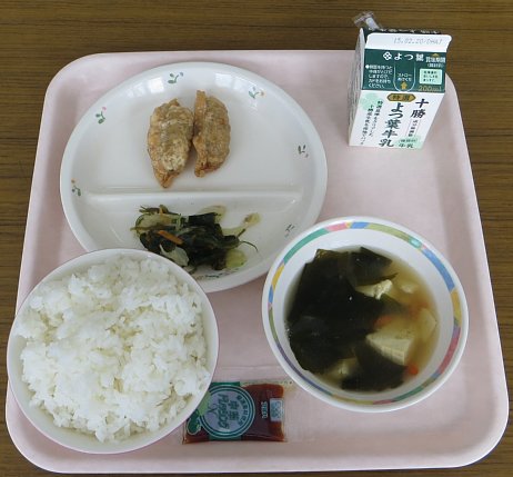 今日は海藻尽くしな給食です。汁物は豆腐とわかめのスープ。わかめがたっぷり入っています。