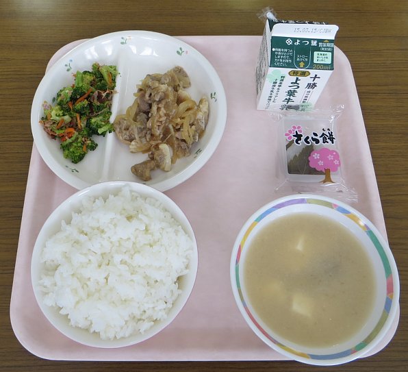 桜餅は、昨日の給食につく予定だったのですが、昨日は給食がお休みとなりましたので、今日の給食につきました。一般的な桜色に色づけられたお米ではなく、白いままのお米で作らえた桜餅でした。