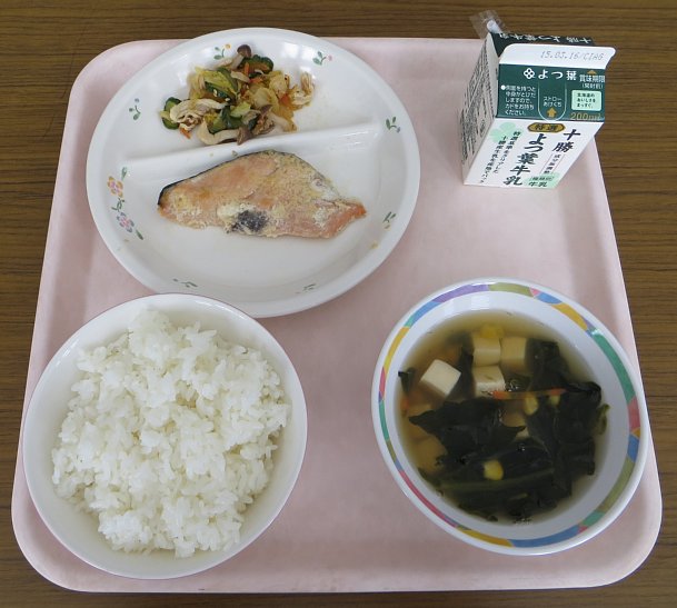 今日のおかずは鮭の黄金焼き!みそ・みりん・マヨネーズ・リンゴを混ぜたソースを塩鮭に塗って焼いたもので、みその香ばしい香りとリンゴの甘さをほんのり感じる、いつもとは一味違う鮭でした。