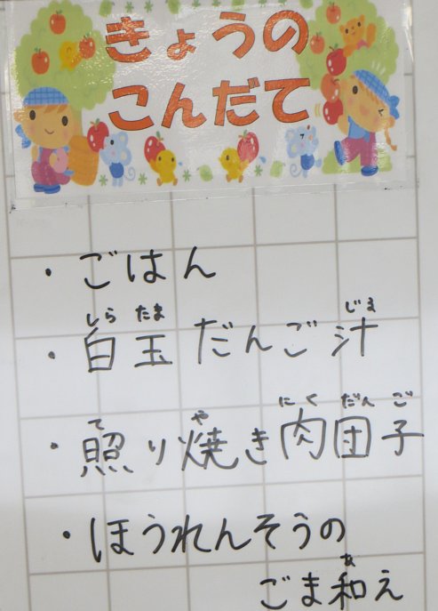 週の始め、月曜日の給食は和食メニュー!白玉団子汁は、鶏肉、大根、椎茸、長ネギ、人参、ゴボウに油揚げと、具だくさんの汁物。1年生の中には、白玉団子を初めて食べたのか「中に何も入ってないの?」と聞いている子もいました。