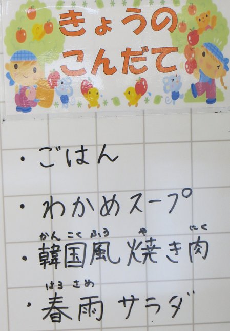 韓国風焼き肉、いわゆる「プルコギ」です。お肉に始めから味付けがしてあり、ご飯ともとてもよく合います。子ども達も、おかわりの行列を作っていました!