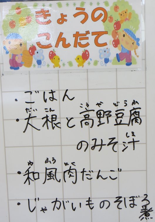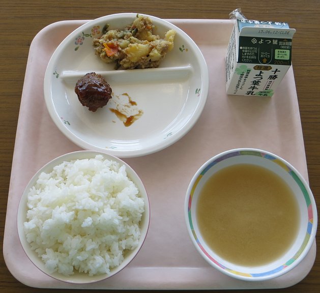 和風肉団子は、ごろっと大きく食べ応えがありました。子ども達の中には、「大きめなのが肉団子、小さめなのがミートボール」という観念がある子もいたようですが、「肉団子は、英語で言うとミートボールになるんだよ」と養護教諭から教えてもらい、「へぇ~」と感心していました。