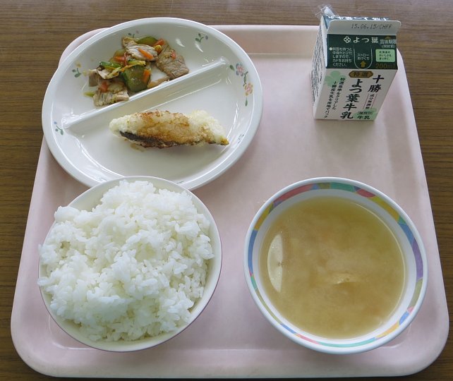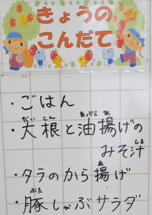 タラのから揚げは、ギュッとしまったタラの身に、片栗粉をまぶして揚げ、ウスターソースをかけた一品。1年生にはちょっと硬かったのか、お箸で割るのも一苦労。でも、かぶりつくとタラの旨味がたっぷり!なから揚げでした。