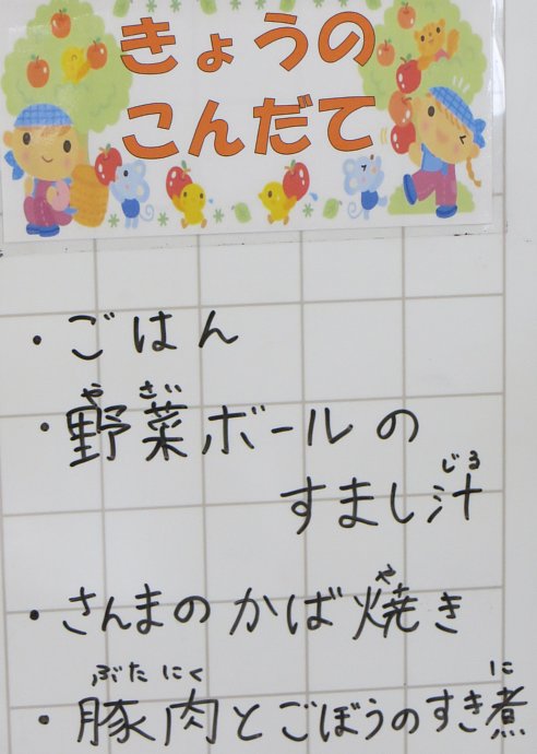 今日のメニューは和食メニュー。野菜ボールのすまし汁は、緑や黄色といった色鮮やかな野菜ボール(白身魚のすり身に野菜を練りこんだもの?)がごろっと入っています。一つ一つが食べやすい大きさで、「野菜きら~い」と言っていた1年生の子もパクパク食べていました。