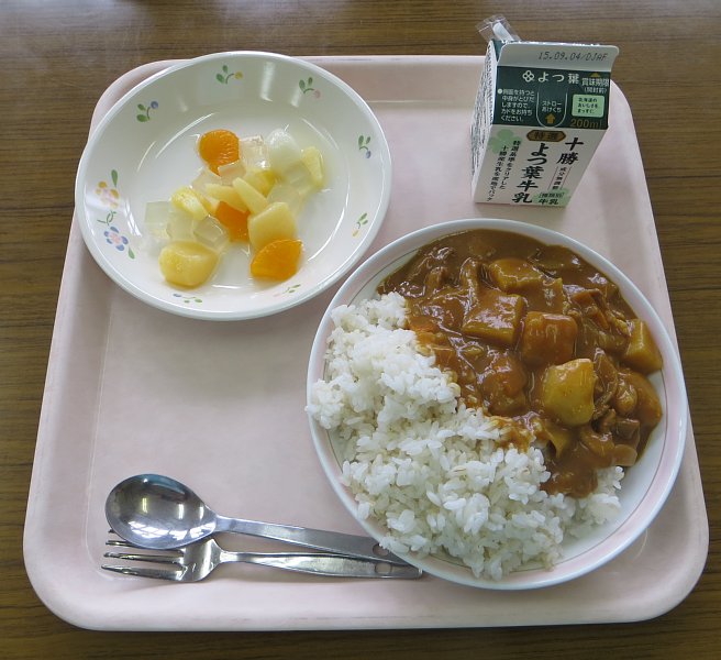 今日の給食は、みんな大好きカレーライス!豚肉に玉ねぎ、人参、ジャガイモがたっぷり入っています。ピリッと辛みもあるのにまろやかな甘みも感じるのは、リンゴやスキムミルクが入っているからでしょうか…?ぷちっとした麦の食感が美味しい麦ごはんにルーをたっぷりかけて頂きます!