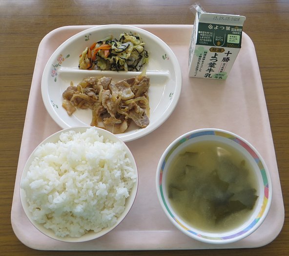 今日のおかずは豚肉のしょうが焼き!玉ねぎの甘みと豚の脂の甘み、そしてしょうがのピリッとした味が合わさり、ご飯が進む味付けとなっています!…ですが、1年生や2年生にとってはこれくらいのしょうがでも辛く感じるらしく、「辛い~」と言いながら食べている子達もいました。4年生以上の子達からはそのような声は聞こえてこなかったので、この味が美味しく感じるにはまだ少し時間が必要かも…?