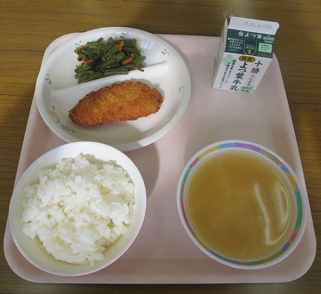 今日の給食はセレクト給食!事前に子ども達から豚カツか鮭フライかを選んでもらっていました(2枚目の写真が鮭フライ、3枚目が豚カツです)。