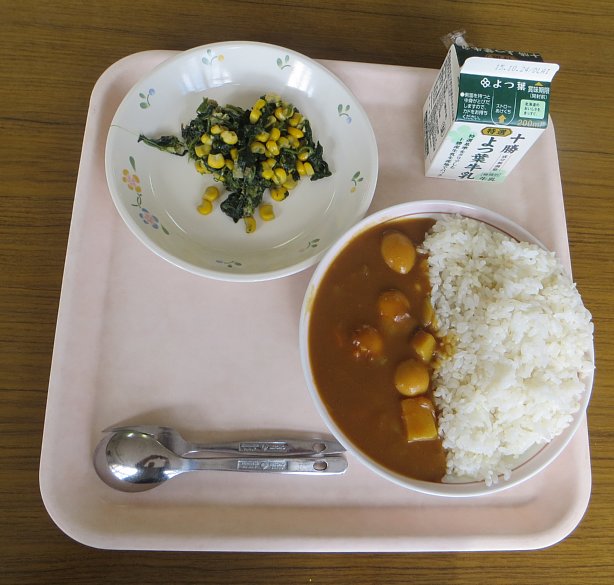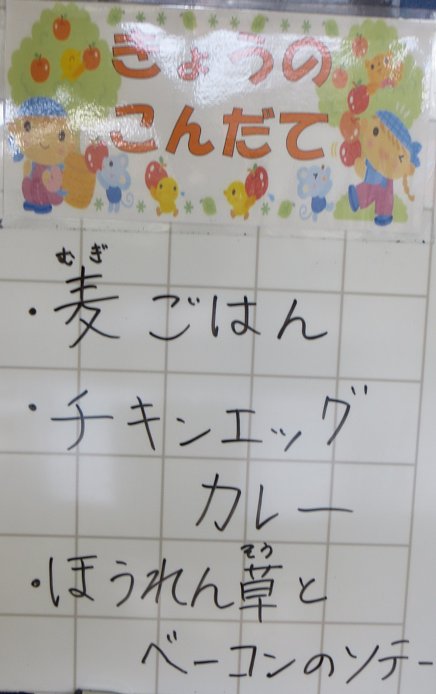 今日のメインはエッグチキンカレー!いつもの麦ごはんにうずらの卵がたっぷり入ったカレーがかかっています。子どもって、うずらの卵好きですよね?今日もおかわりするときに、「卵4個お願いします!」「じゃあ僕は卵5個で!」「あ、6個入っちゃった。」「やったぁ~!」…と、卵を求めて行列する姿が見られました(^^。