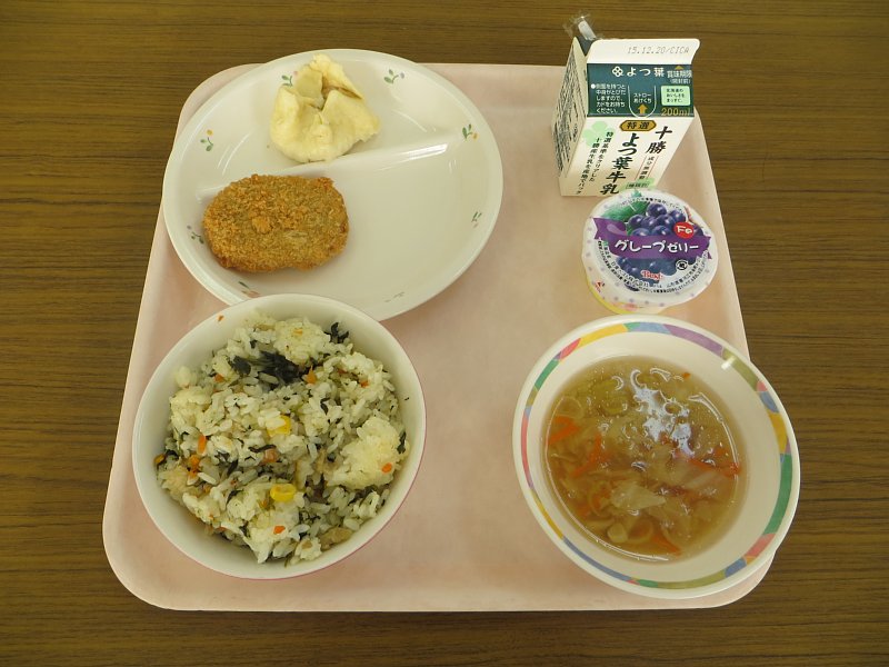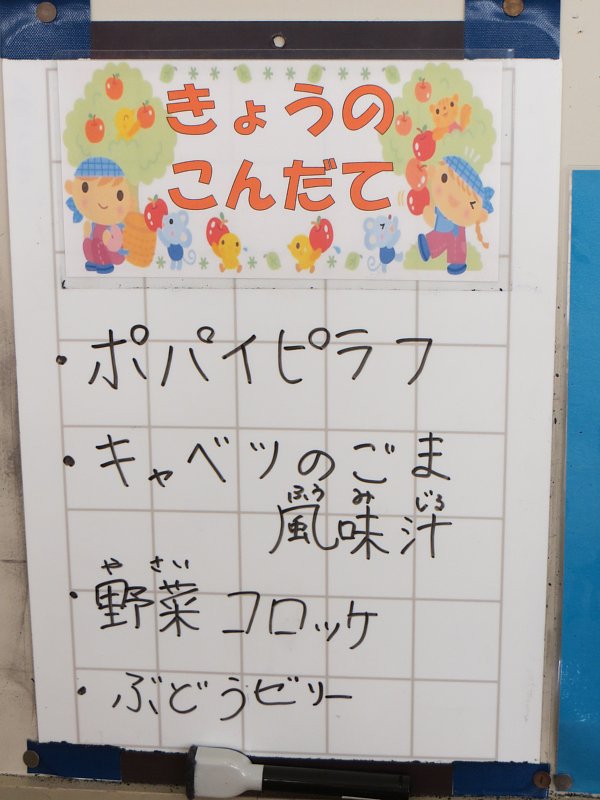 さてさて、本日の給食はというと、ご飯はほうれん草とコーンたっぷりのポパイピラフ!コーンの甘さとバターの香りが香り立つ、とても美味しいピラフでした。保護者の方にも好評でした。