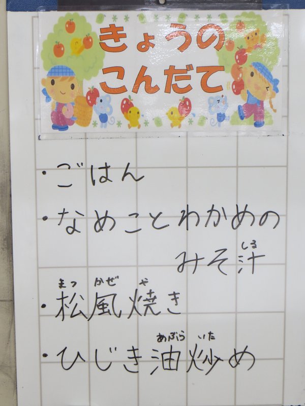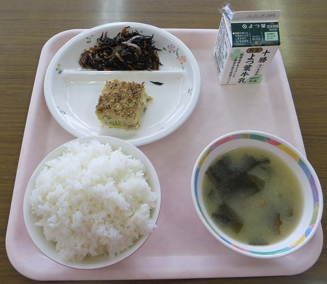 さぁ、久しぶりの給食のメニューはというと…おみそ汁の具は、なめことわかめ。今日の様な冷え込む日には、温かいおみそ汁がうれしいですね。