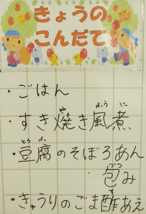 きゅうりのゴマ酢和えは、酢とゴマの香りがよく聞いた、さっぱり系の一品。子ども達も、そして職員も、お腹いっぱい給食を食べて、お昼からのスキー、がんばりました!