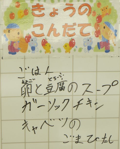 おかずにはガーリックチキン。献立表を見ると、塩、ニンニク、白ワイン、オリーブオイル、しょうゆ、みりん、こしょう、バジルとたくさんの調味料を使っているようで、ちょっぴり大人な味のチキンでした。