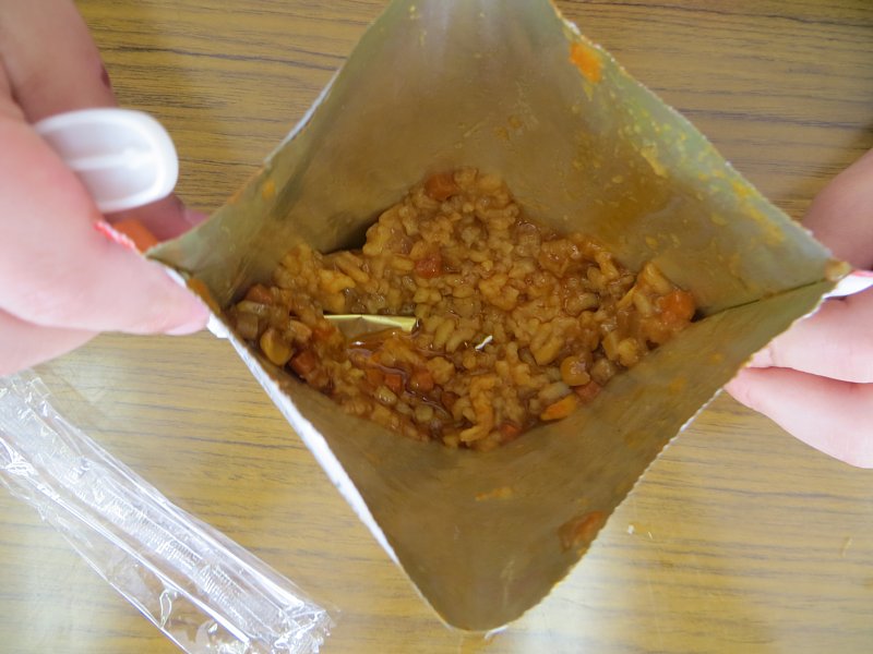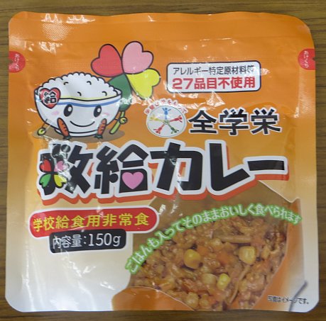 そこで、緊急時に備えて補完してある非常食を食べることになりました。その名も「救給カレー」。非常食には、α化したお米にお湯をかけて戻して食べるタイプのものもありますが、この救給カレーはレトルトタイプ。お湯で温めて食べます。中身はというとご飯とカレーが混ざった状態で入っています。トマトベースのカレーに人参やコーン、きのこといった具も入っていて味はなかなかのもの。既にカレーと混ざっているため、ご飯は少しべちゃっとしているので、子ども達の中にはあまり好きじゃない、と言っている子もいましたが、緊急時の食べるものがないという時にこれが食べられる、と考えると十分満足できるのではないでしょうか。ただ一つ不満点があるとすれば…大人には少し量が足りないかも…(^^;。