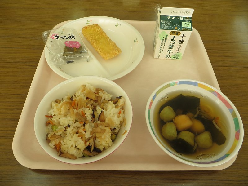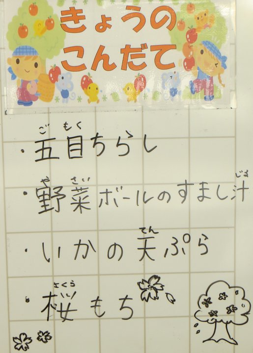 今日は3月3日、桃の節句ですね。今日の給食のご飯は、五目ちらしでした。s蔵臀部は乗っていませんでしたが、酢の効いた、具もたっぷりのちらしずしでした。1年生の子は、「今日のご飯はちょっと酸っぱい~(>_<」と言いながら食べていましたが…(^^;。