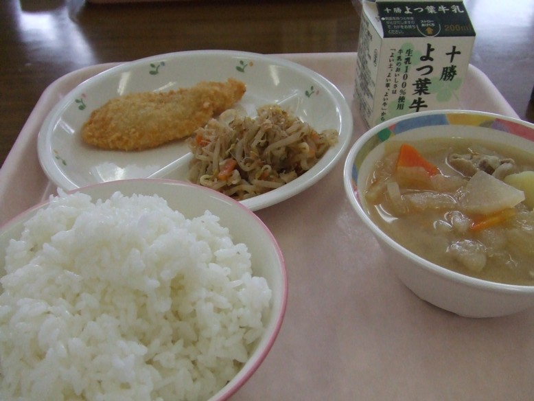 1月26日の給食 ごはん 豚汁 タラフライ もやしのおかか和え (675kcal) 豚汁にタラのフライ美味しかったです。 児童は、フライにソースをかけて、美味しそうに食べていました。 文責:じゅん