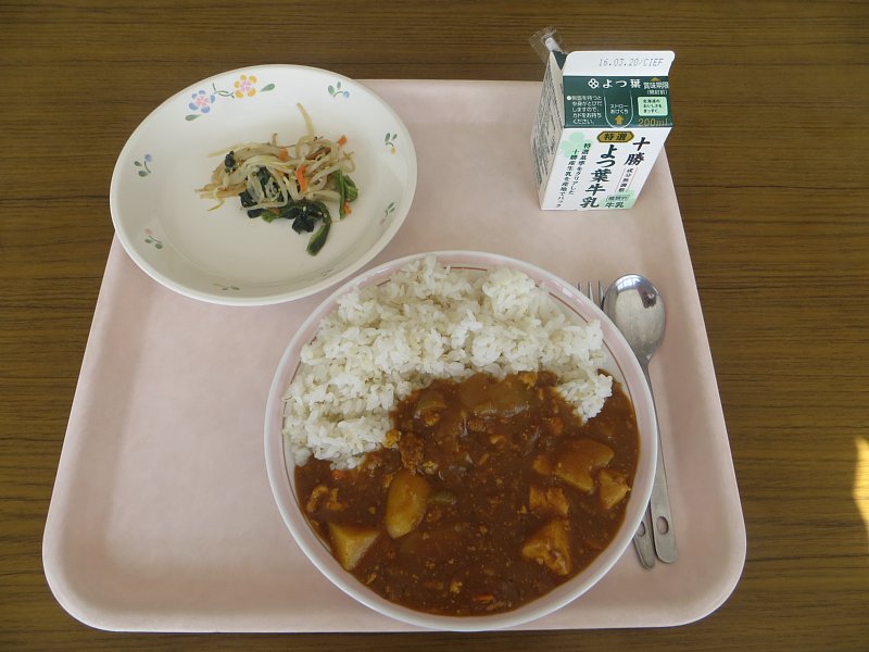 今日は、みんな大好きカレー!今日のカレーは豆腐とひき肉のカレー。世の中には「麻婆カレー」という、麻婆豆腐とカレーが合わさったものも存在しますが、今日のカレーはまさにそのような感じです。麻婆の味はしないものの、豆腐とひき肉の食感はまさに麻婆豆腐!ホクホクのイモと、ぷるぷるの豆腐が一緒に味わえる、ちょっと変わった、でもおいしいカレーでした。