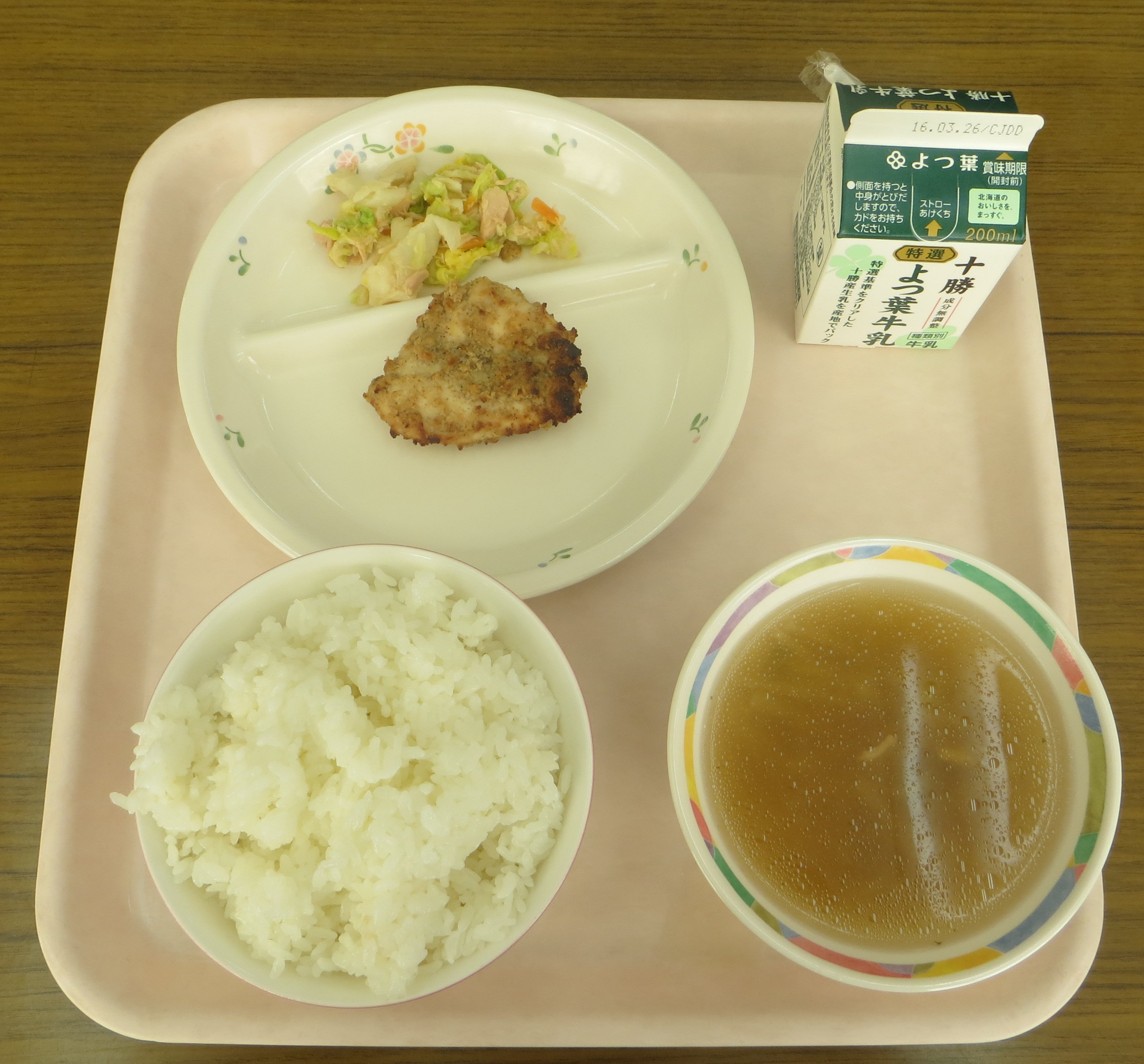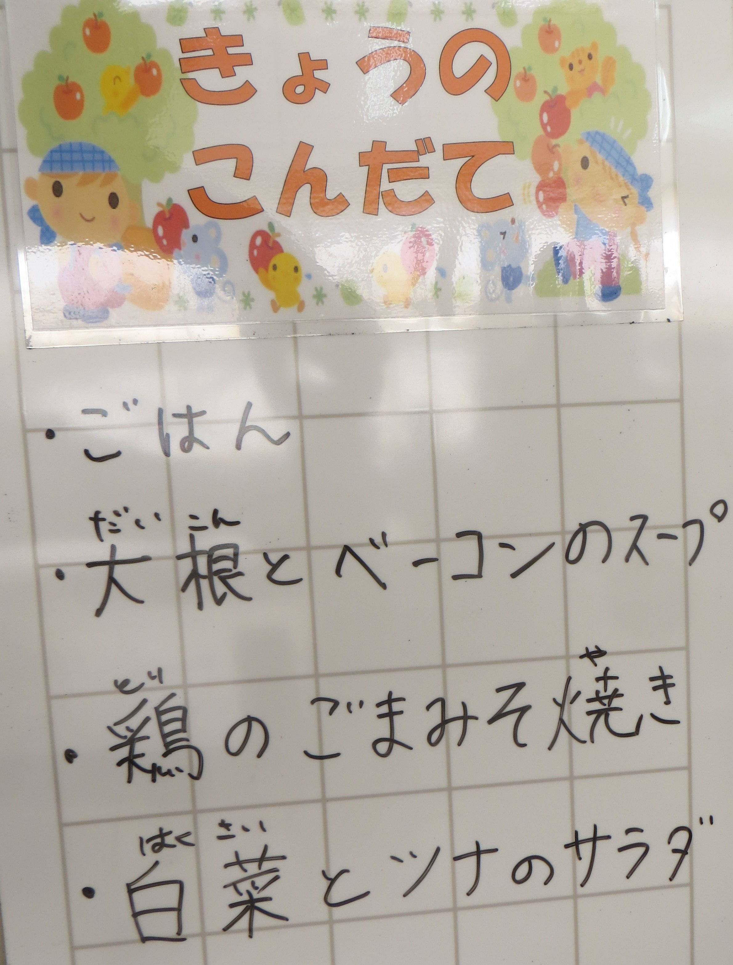 今日の汁物は、大根とベーコンのスープ!ブイヨン仕立てのさっぱりしたスープに、大根とベーコンがたっぷり!さっくりした大根の食感もいいですね。それにしても、だい「こん」にベー「コン」と語感も楽しいこのスープ、他にもレンコンだとかヤーコンだとか、色々と入れたくなりますね…。