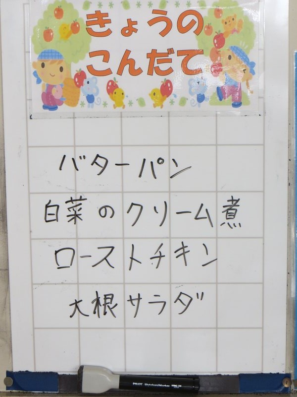 今日のパンは豆乳パン(メニューの写真ではバターパンとなっていますが、間違いでした(^^;)。ふわっふわのパンで、クリーム煮をつけて食べている子も…。