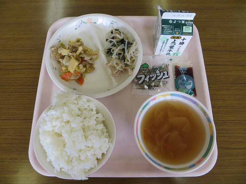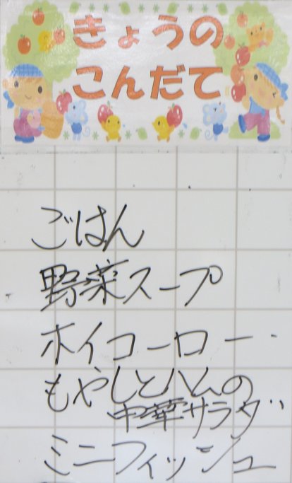 もやしとハムの中華サラダは、中華ドレッシングをかけていただきます…が、その中華ドレッシングをたっぷりかけて、「せんせいー、これ飲んでいいですか~?」という子も…(^^;。