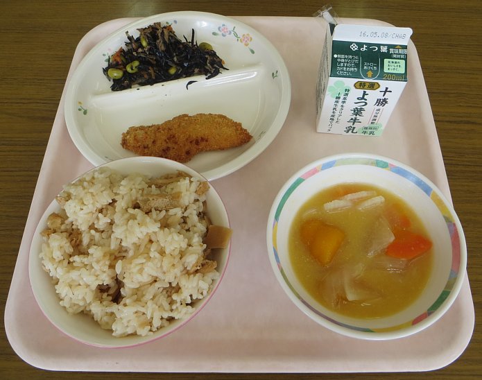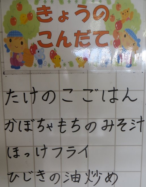 今日のご飯はたけのこご飯!醤油の香ばしい香りと、シャキシャキのたけのこの食感がたまりません!たけのこは今が旬、春を感じる食材ですね!