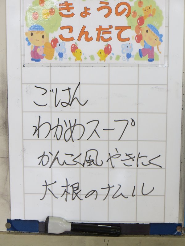 さて、今日の給食のメニューは韓国料理!スープはわかめスープ。わかめとコーンがたっぷり入っています。