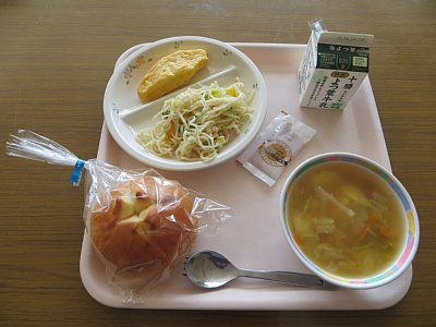 じゃがいもパン ポトフ プレーンオムレツ ラーメンサラダ 牛乳