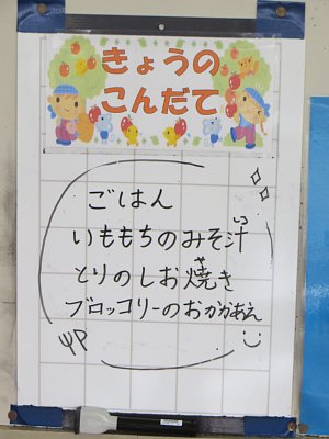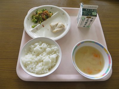 さて、本日25日の給食です。今日のみそ汁の具はいももち!もっちりしたいももちがたっぷり入っていました。