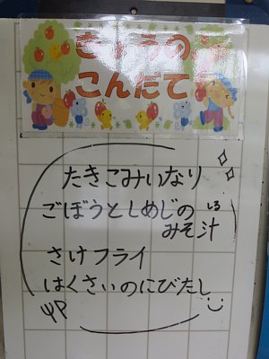鮭フライは、ふっくらした鮭の身と、カリッカリの衣が美味しいフライです。白菜の煮びたしじは、白菜、ニンジン、豚肉、いんげんがたっぷり入って食べ応えも十分、炊き込みいなりともよく合う一品でした。