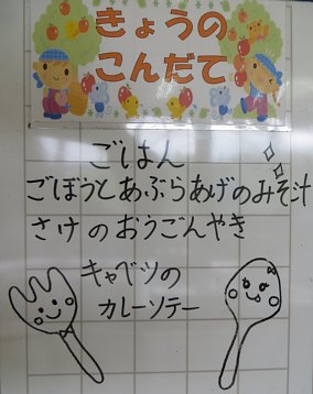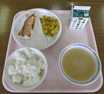 給食中、なぜこの料理は「黄金焼き」という名前なのか、といった話題が持ち上がりました。一般的に「黄金焼き」というと、魚の切り身を焼き、仕上げに卵黄を塗ったものなんだそうです。ですが、今回のこの黄金焼きは、味噌とマヨネーズで味付けしてあり、その二つを混ぜた色が黄金色だから黄金焼きなのではないかという話をしていたのですが、実のところはどうなのでしょうか…。さらにこの料理、「おうごんやき」と読んでいたのですが、調べた所、上記の焼き魚に卵黄を塗って仕上げる料理は「こがねやき」と読むんだそうです。今日の「黄金焼き」は、果たして「おうごん」なのか「こがね」なのか…謎が深まるばかりです…。