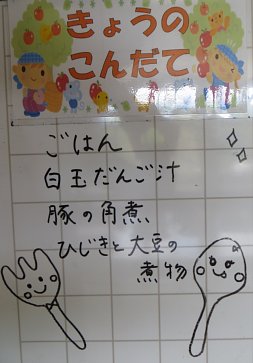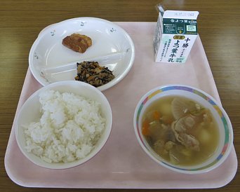 今日も暑い一日となりましたね~。さて、今日の給食ですが、汁物は、白玉だんご汁!もちっとした白玉がたっぷり入っています。その他にも鶏肉、ニンジン、しいたけ、長ねぎ、大根、ゴボウ、油揚げが入った具だくさん汁でした。今日みたいな暑い日に温かい汁をすするのもまたいいものですね。