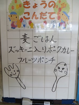 今日のカレーはズッキーニ入り。ズッキーニは最近では夏野菜の定番となってきましたね。カリウムやベータカロテン、ビタミンBやビタミンC等を豊富に含んでいて、風邪の予防や疲労回復、アンチエイジングや高血圧にも効果があるそうですね。いつもは給食を食べるのに時間がかかってしまう子も、カレーの日には時間内に食べ終わることができました。