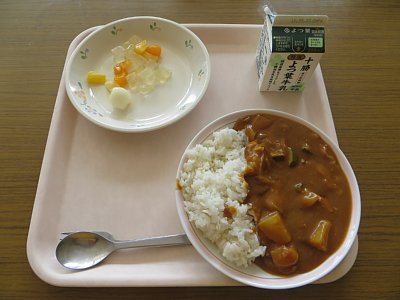今日の給食は、みんな大好きカレーライス!今日は気温も上がり、ようやく夏らしい天気が戻ってきましたが、暑い日に汗をかきながら食べるカレーもまたいいものですね。