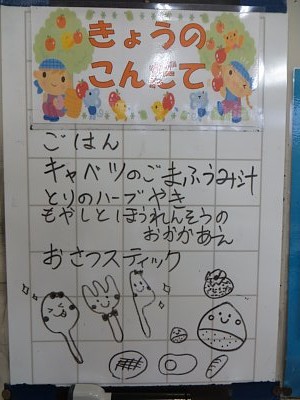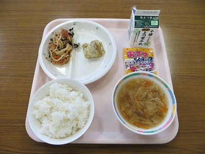 今日は1学期最後の給食です。今日の汁物はキャベツのごま風味汁。白ごまとごま油の香りが食欲をそそります。また、キャベツ、ニンジン、長ねぎ、しめじと、具がたっぷりと入っています。これだけでも十分おかずになりますね。