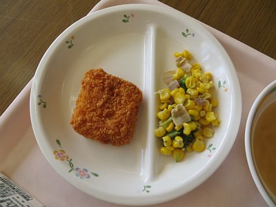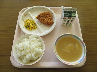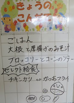 今日はセレクト給食でした!選べるメニューは、かつおフライ(2枚目の写真)かチキンカツ(3枚目の写真)か。どちらか好きな方を事前に選んでいました。結果、教員含め11人中かつおフライが7名、チキンカツが4名でかつおフライの方が多く頼まれていたようです。