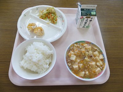 さて、今日の給食は麻婆豆腐です。中には、ご飯にのせて麻婆丼にしている子も。ご飯によくあう麻婆豆腐でした。