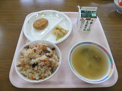 今日のご飯はきのこの炊き込みご飯!外はちらちらと雪が舞っていましたが(^^;、秋の薫りたっぷりのご飯でした。