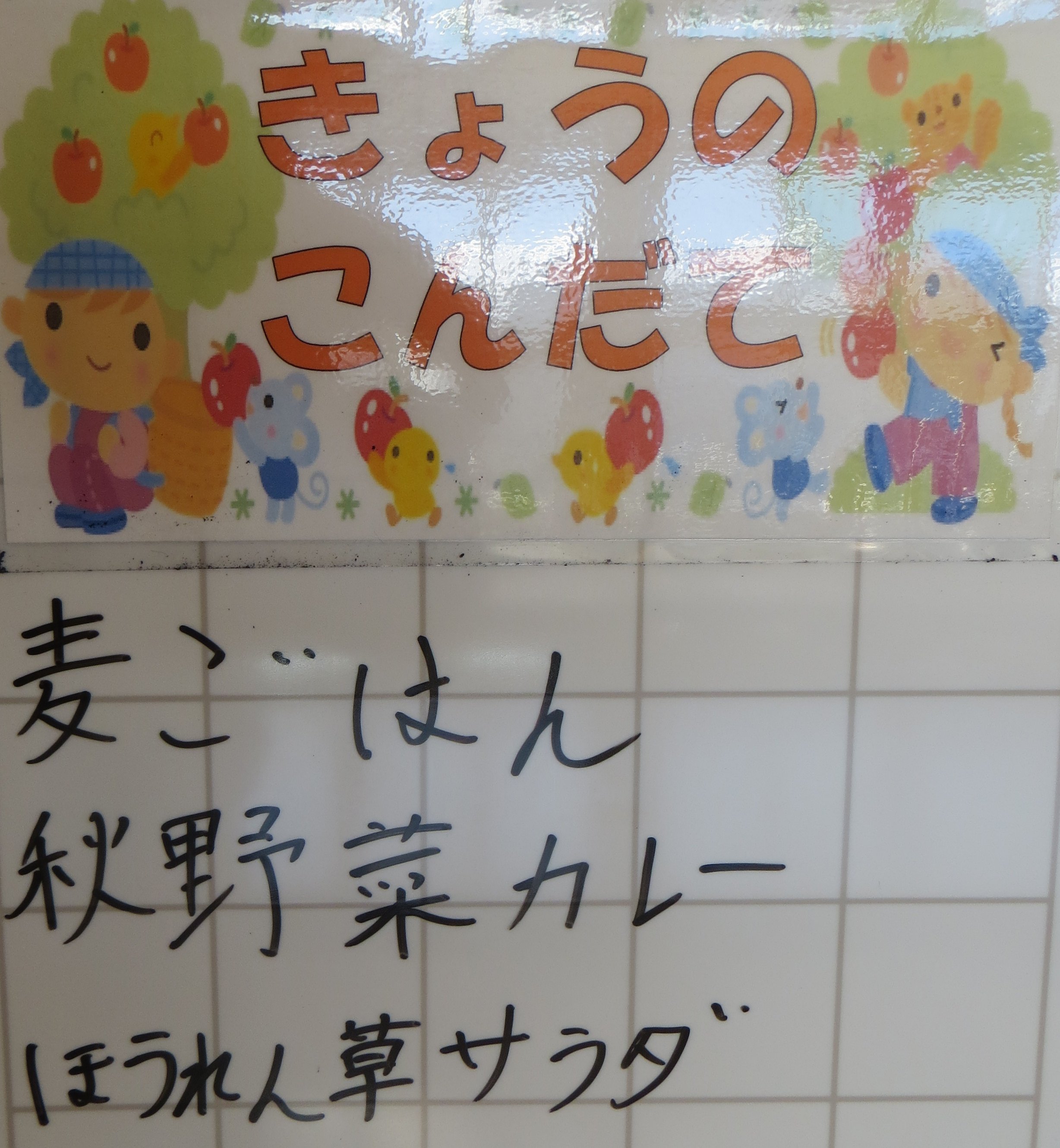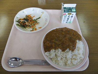 今日は、みんな大好きカレーの日!今日のカレーは秋野菜カレーです。ジャガイモの代わりにカボチャが入っていて、ピリッとした辛さの中にもほんのりとした甘さを感じる、美味しいカレーでした。