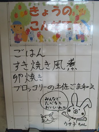 今日のメニューはすき焼き風煮!焼き豆腐や玉ねぎ、にんじん、白菜、しいたけ、つきこんにゃく、長ねぎ、豚肉がたっぷり入っています。ご飯との相性もばっちり!…できればこれに生卵があれば最高なのですが…それはわがままですね(^^;