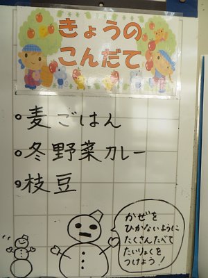今日はみんな大好きカレーの日!今日のメニューは冬野菜カレー!長芋や大根、白菜といった、普段のカレーには入っていない具材が入ったカレーでした。味のしみこんだ大根やとろっとした舌触りが美味しい長芋、そしてスプーンにちょこっとくっついてくる姿が何ともかわいらしい(?)白菜が、普段のカレーとは一味もふた味も違った味わいを醸し出しています。冬野菜カレーであるのと同時に、なんとなく和風カレーでもあるかなぁ…なんて思ったりもしました。